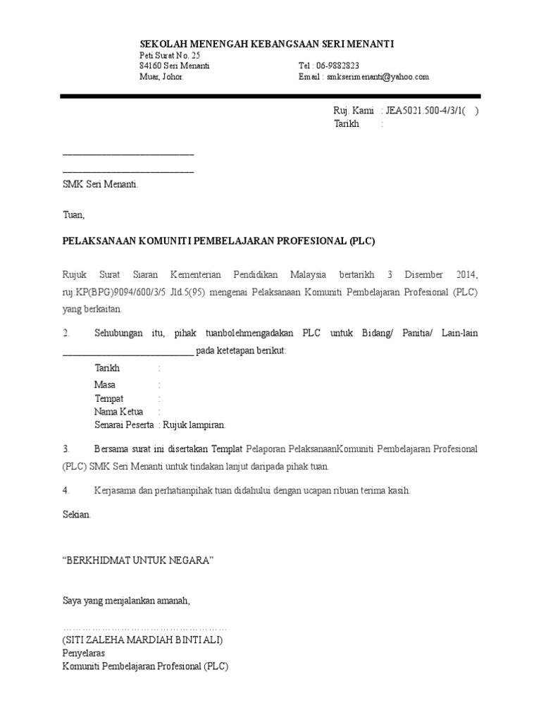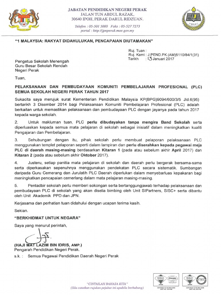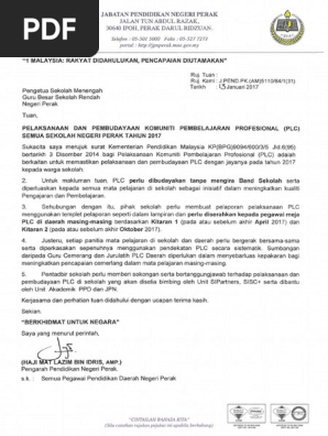 Penyelaras program peringkat sekolah. PLC di sekolah untuk Surat siaran pelaksanaan PLC kepada semua sekolah Men Rend memantapkan Negeri Perak telah dikeluarkan pada 912015 rujukan. 4 Pelaksanaan PLC PK Pentadbiran Ketua Panitia Guru MP.